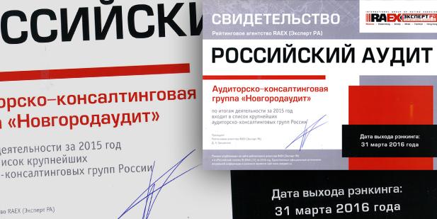 Общество с ограниченной ответственностью "Аудиторско-консалтинговая группа "Новгородаудит" по итогам 2015 года заняло 21 место в рэнкинге аудиторско-консалтинговых групп России. Рэнкинг подготовлен агентством "Экcперт РА".